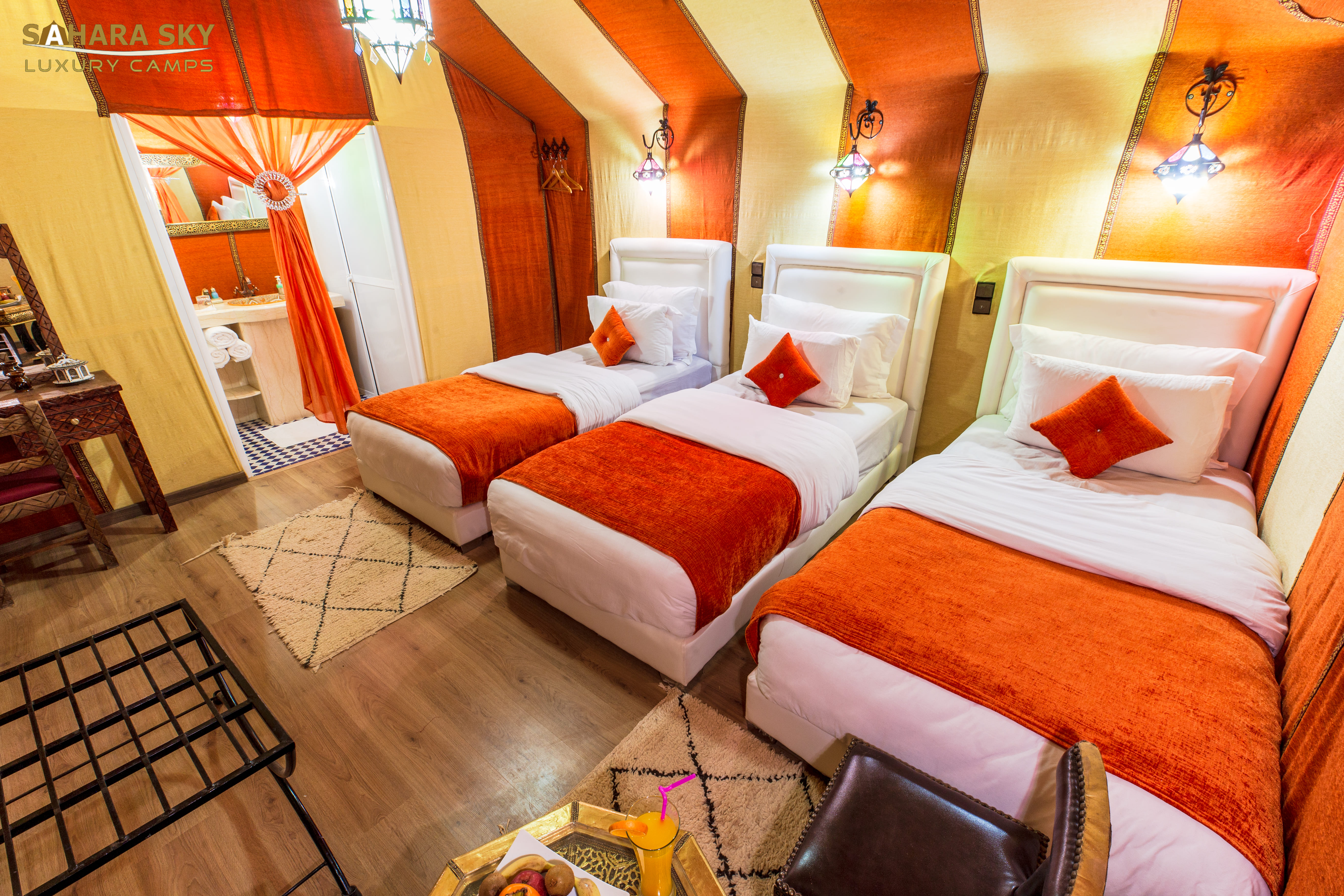 The luxury individual tents are located far from each other, leaving you all alone in the Merzouga Desert. Berber rugs cover the slightly uneven rattan floors,. The large beds are topped with embroidered blankets and blankets - essential in winter, and each tent has its own bathroom and toilet, and a hot shower. And natural hammam products: few experiences can beat an overnight desert camp, Sahara Sky Luxury Camp takes this to an unexpected level of luxury in a secluded setting, far from mass tourism in Merzouga. Dine under the stars, sleep in the desert winds and enjoy the romance of it all, large white tents furnished with a rustic chandelier, Outside the tents, there is a sun lounger and a coffee table in the sand, as well as a fireplace and a dining area. Imagine you are outside of Desert.